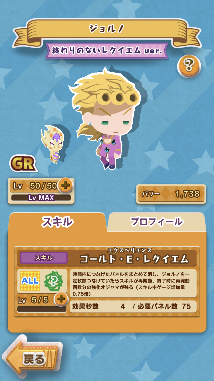 ・スキル効果中のスキル再発動に必要なジョルノパネル数は4→6→8…と徐々に増えていく。
